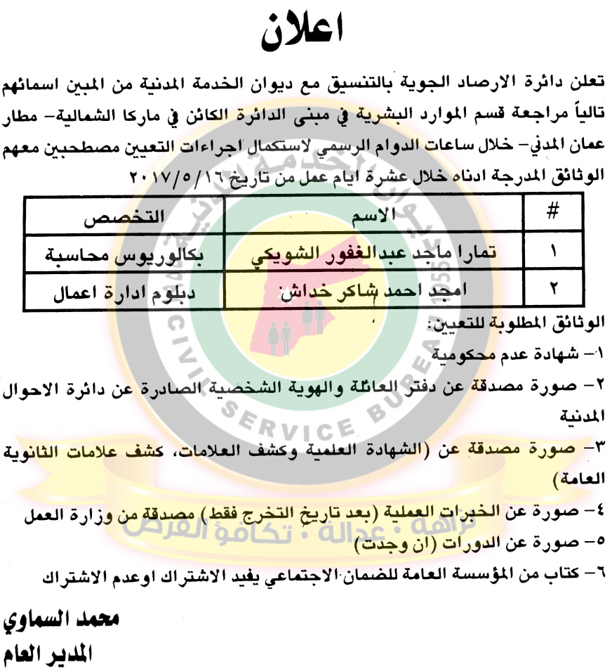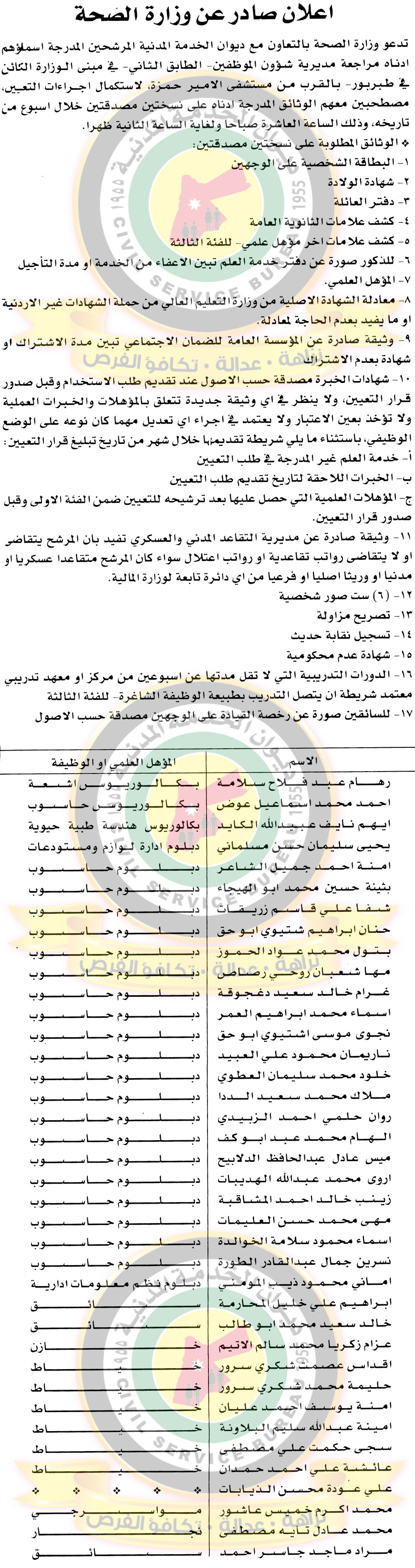 : دعا ديوان الخدمة المدنية التالية اسماؤهم لاجراء المقابلات الشخصية لغايات التعيين او استكمال التعيين.