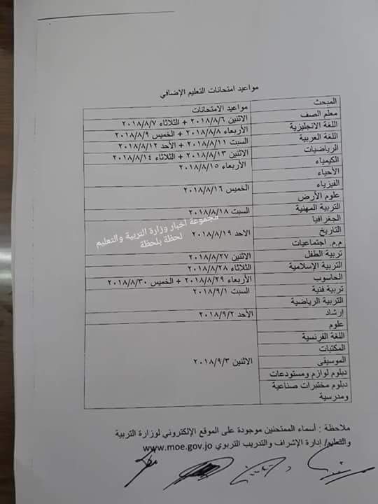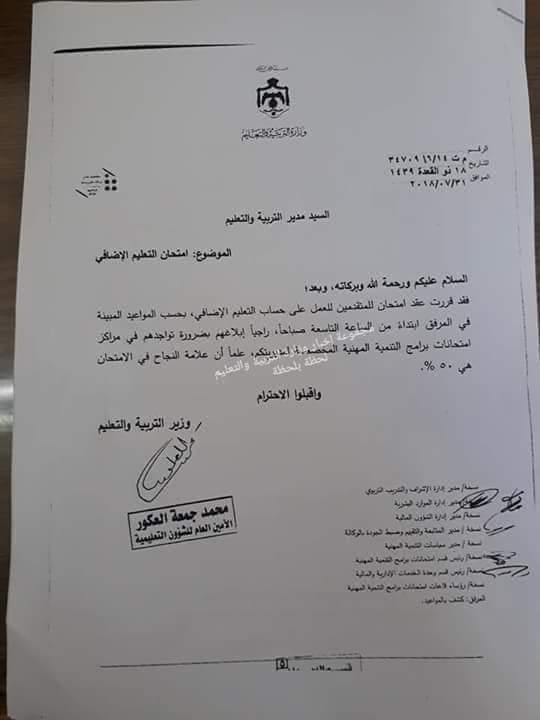 - عممت وزارة التربية والتعليم على الميدان التربوي مواعيد عقد الامتحان للمعلمين المتقدمين للعمل على حساب التعليم الإضافي، وحددت علامة النجاح في الامتحان 50 بالمئة .
