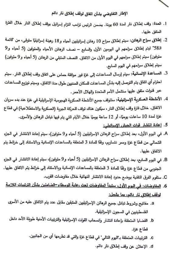 وتنص وثيقة ويتكوف على أن الرئيس الأميركي دونالد ترامب جاد بشأن التزام الأطراف باتفاق غزة وسيعلن عنه شخصيا في مؤتمر صحافي. كما تنص الوثيقة على أن أميركا ومصر وقطر ستضمن استمرار وقف النار لمدة 60 يوما ولأي تمديد محتمل، فيما سيستكمل مبعوث ترامب الخاص تفاصيل الاتفاق ويتولى رئاسة المفاوضات.