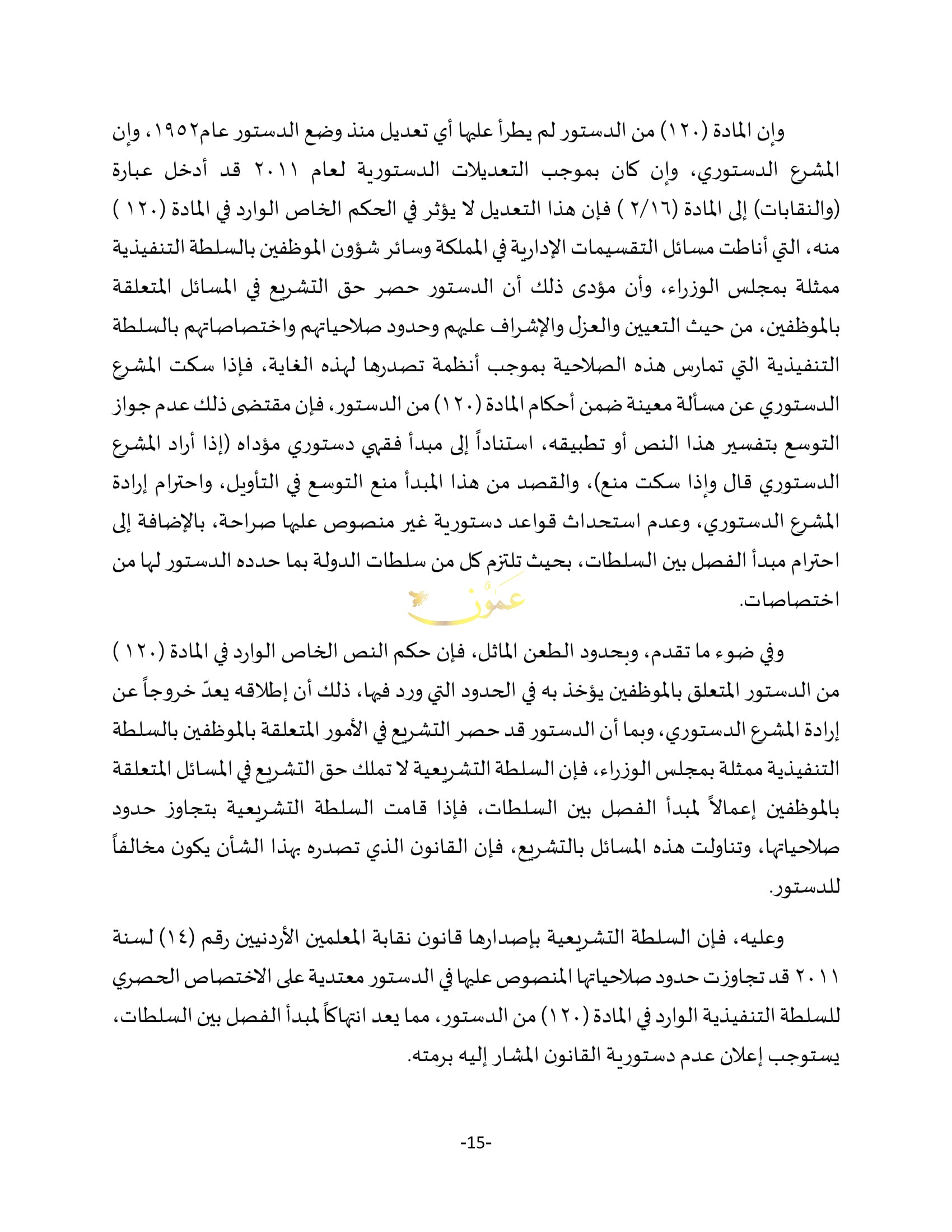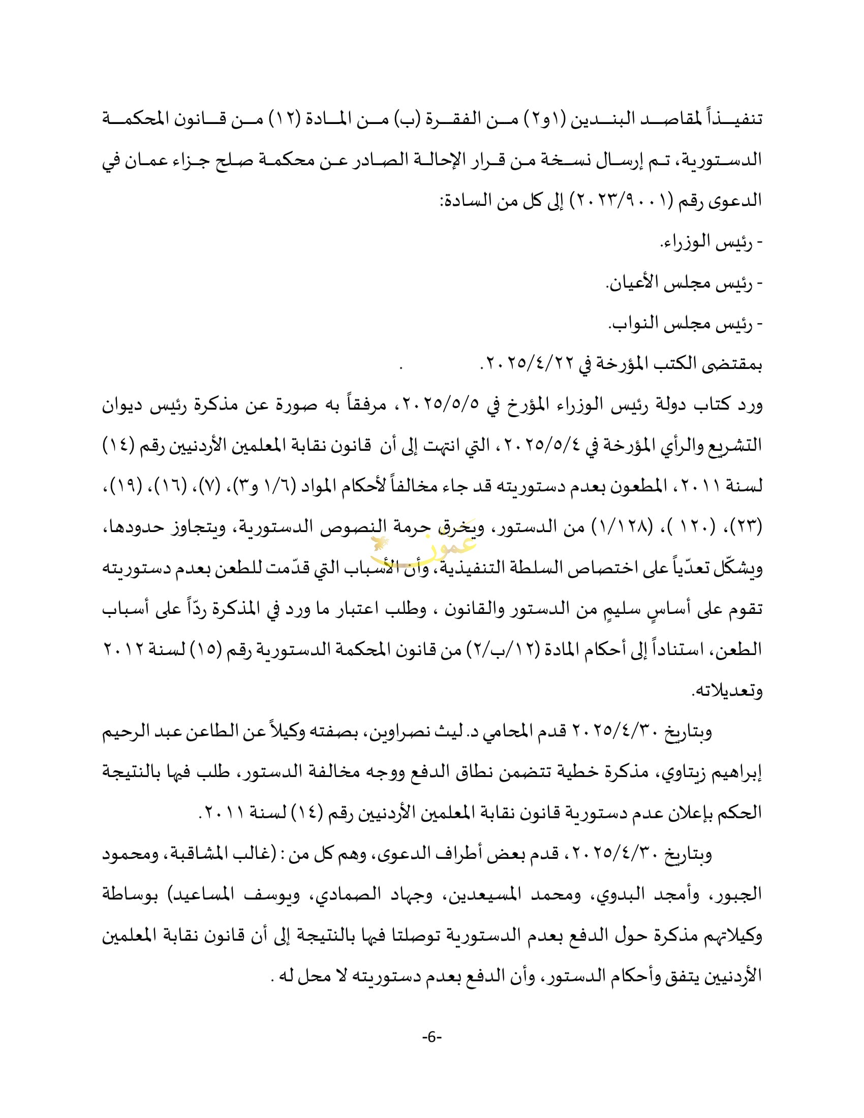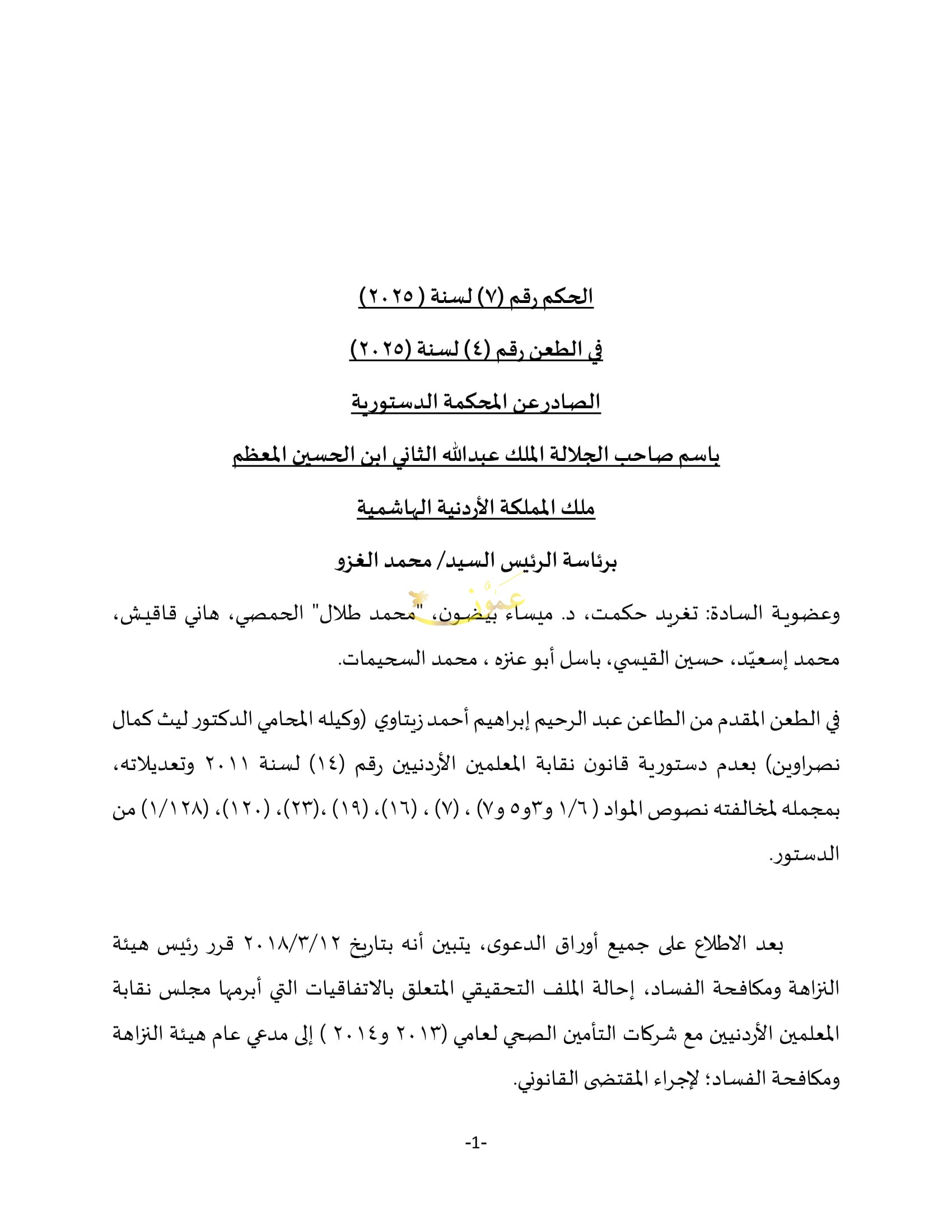 - أصدرت المحكمة الدستورية بهيئتها العامة اليوم الخميس، حكما يقضي بعدم دستورية قانون نقابة المعلمين الأردنيين رقم (14) لسنة 2011 وتعديلاته برمته، واعتباره باطلا من تاريخ صدور هذا الحكم.