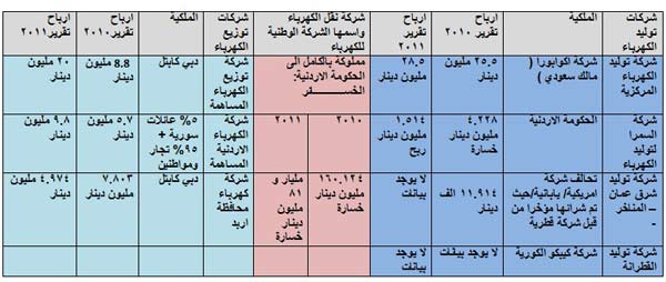 اولا : يوجد بديل واقعي ومباشر : الجدول ادناه ، يبين الارباح التي حققتها شركات توليد الكهرباء، وشركات توزيع الكهرباء، والتي تم خصخصة و بيع غالبيتها الى شركات، قطرية، سعودية ، امريكية، وكورية ومستثمرين من الخارج، من قبل حكومات " الفساد " المتعاقبة، حيث بلغت مجموع الارباح خلال سنة 2010، و2011 مليار و 670 مليون دينار، بينما بلغت خسائر الشركة الوطنية للكهرباء المملوكة للحكومة في سنة واحدة فقط – ويا للمفارقة – مليار و 81 مليون دينار ( * طبعا هذه الخسارة سببها صفقة فساد كبيرة سنوضحها في النقاط ادناه )، وفي ضوء الارباح المتحققة يمكن للحكومة وبقرار جريء، ان ترفع ضريبة الدخل على ارباح هذه الشركات، بدلا من " التساهل " في سرقة جيب المواطنين.