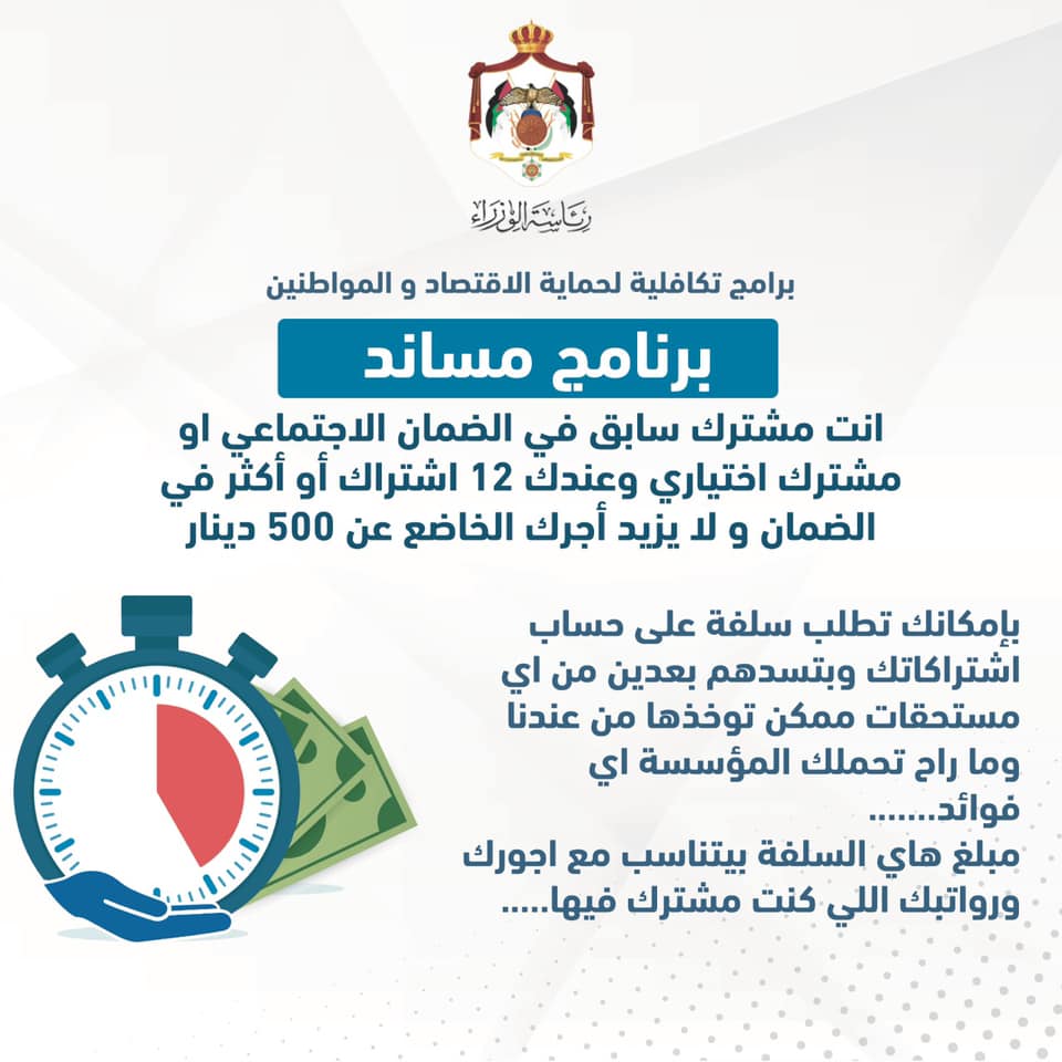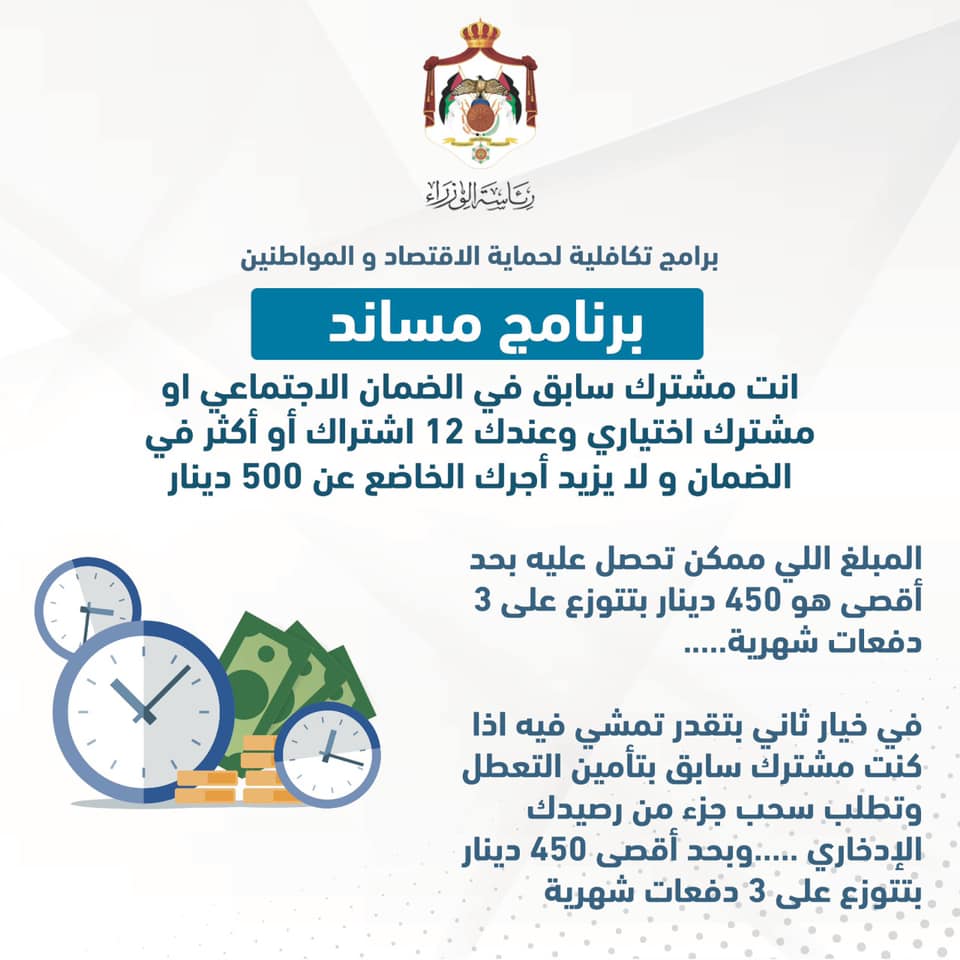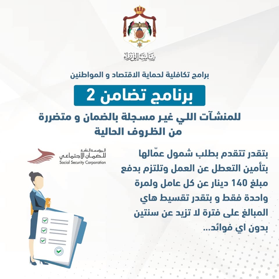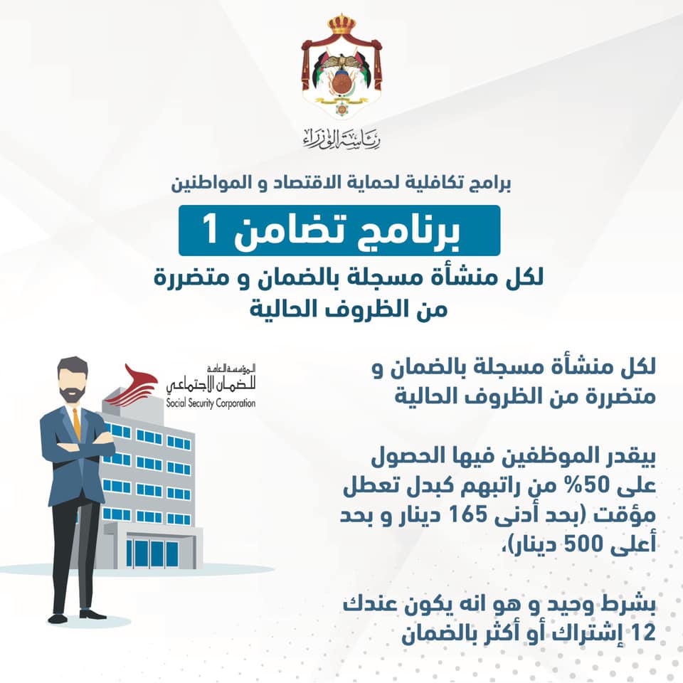 وجاء أمر الدفاع رقم 9 لحماية عمال المياومة والمنشآت الاقتصادية من خلال برامج تكافلية من الضمان الاجتماعي، بالاضافة للاعلان عن تبرع رئيس الوزراء والوزراء وكبار الموظفين بجزء من رواتبهم.