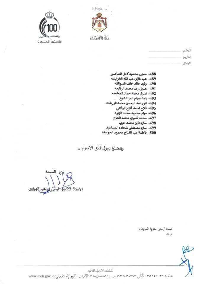 - صادق وزير الصحة الدكتور فراس الهواري على تقرير لجنة امتحان مزاولة مهنة ممرض مشارك الناجحين في الدورة الثانية للعام 2021 وعددهم 500 ممرض وممرضة.