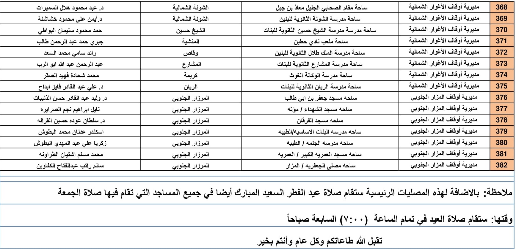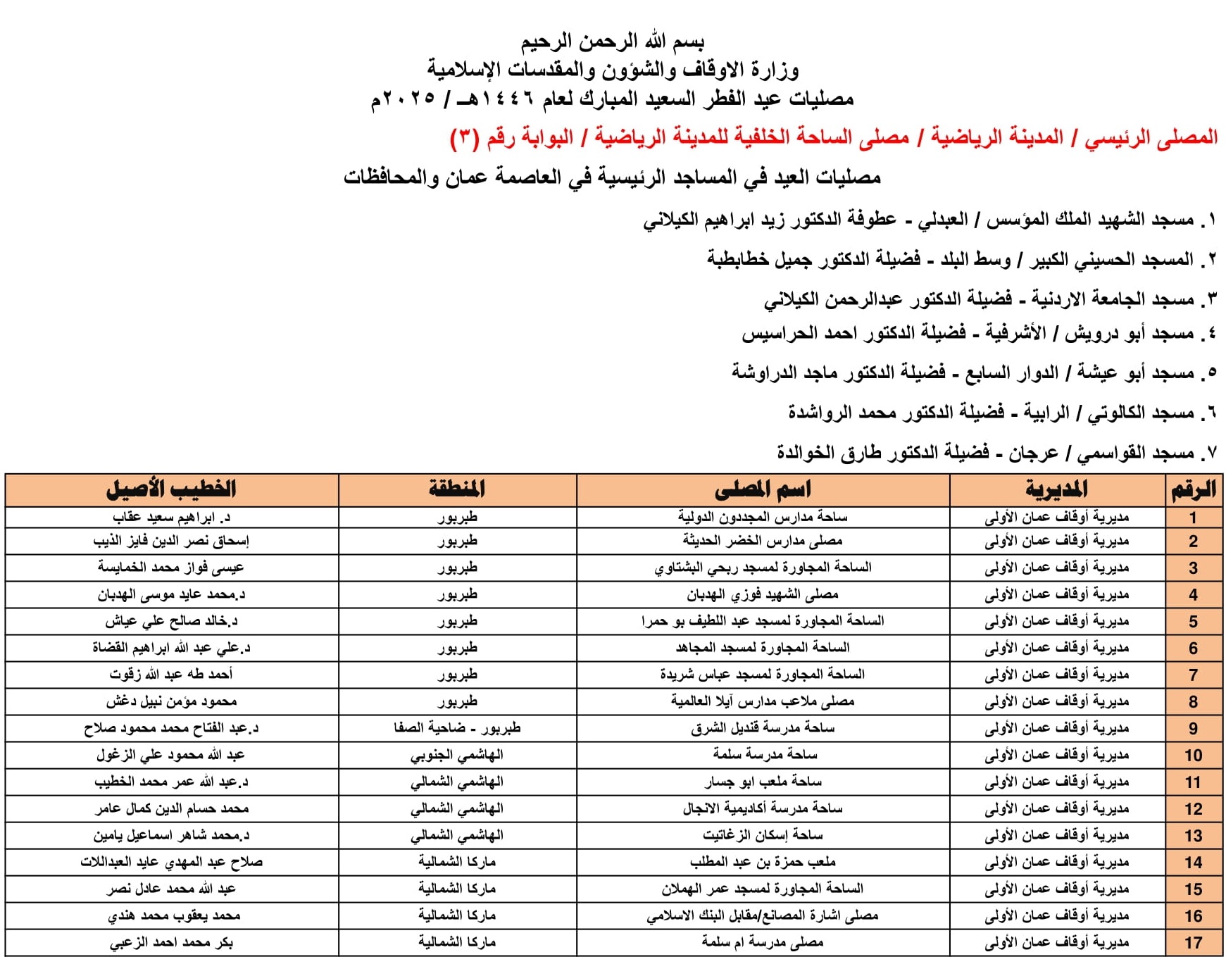 حددت وزارة الأوقاف والشؤون والمقدسات الإسلامية مصلى العيد الرئيسي في المدينة الرياضية العاصمة عمّان، بوابة رقم (3).