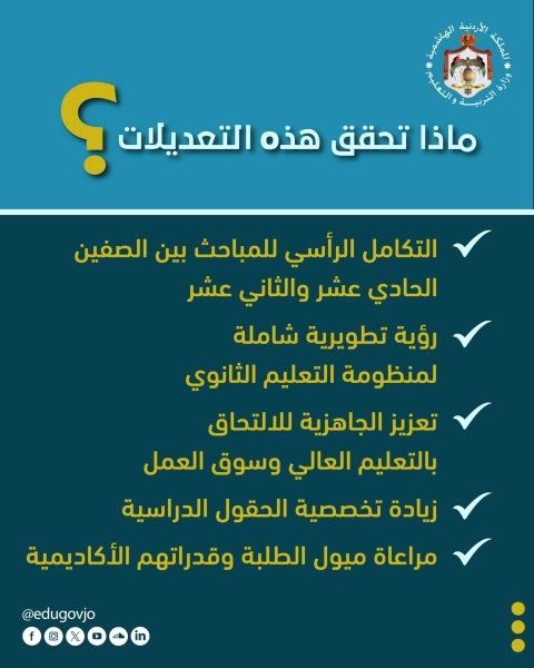 وأكّدت الوزارة أن هذه التعديلات تحمل جملة من المزايا، وتسهم في تعزيز جودة التعليم من خلال المحافظة على التكامل الرأسي للمباحث بين الصفين الحادي عشر والثاني عشر، وتشكل خطوة ضمن رؤية تطويرية شاملة لمنظومة التعليم الثانوي، بما يواكب المتغيرات التعليمية العالمية، ويعزز جاهزية الطلبة للالتحاق بالتعليم العالي وسوق العمل.