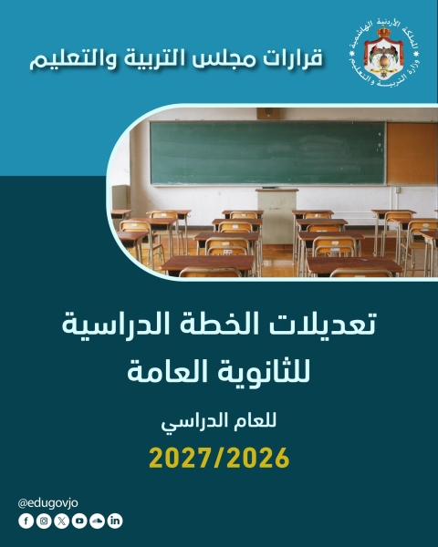 أقرّ مجلس التربية والتعليم تعديلات على الخطة الدراسية لمرحلة الثانوية العامة، يبدأ تطبيقها اعتبارًا من العام الدراسي 2026/2027، وذلك في إطار جهود وزارة التربية والتعليم المستمرة لتجويد العملية التعليمية وتحسين مخرجاتها، وبناء على التغذية الراجعة الواردة من الميدان التربوي، وآراء المختصين والخبراء.